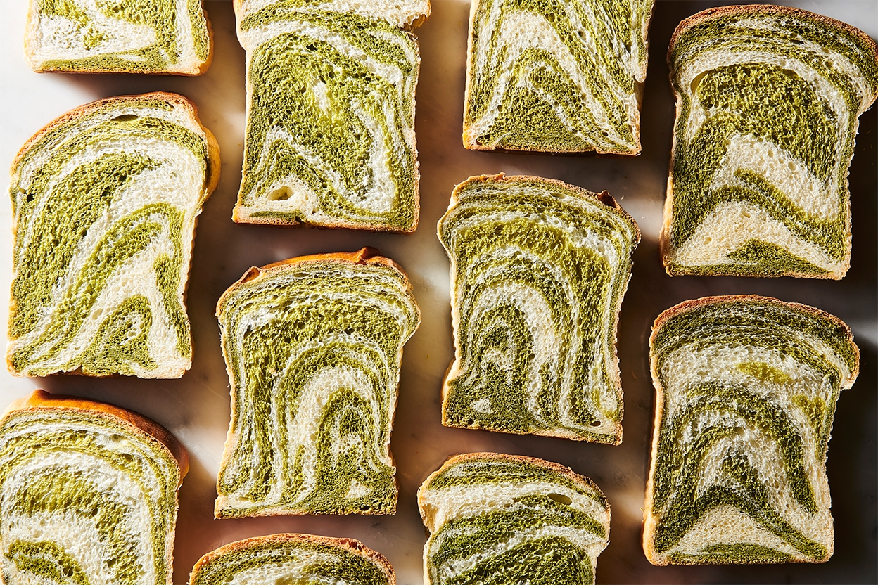 Transfer the remaining half of the dough back to the bowl of the stand mixer and add the matcha and water. Knead, beginning on low speed and working up to medium, until fully incorporated, about 1 to 2 minutes. (Don’t worry about any remaining small clumps of matcha; they won’t appear in the finished loaf.) Transfer the matcha dough to the lightly floured work surface, knead briefly, round into a tight ball, place in greased bowl, and cover.