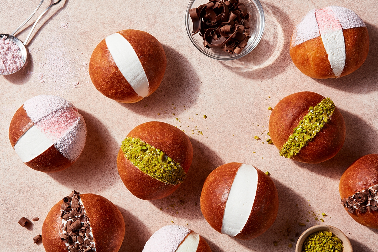 While brioche, which is heavily enriched and gets a long, slow rise, is our favorite foundation for maritozzi, our Beautiful Burger Buns are a faster (and basically just as delicious) alternative.