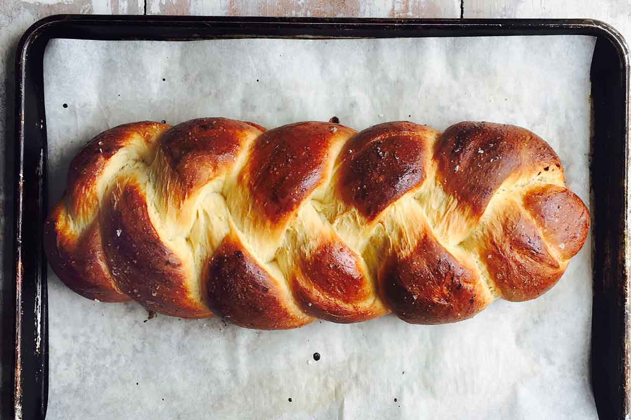Line a baking sheet with parchment paper. Pat the dough out into a long rectangle, roughly 3" x 12". Cut the dough into three long, skinny rectangles and roll them out a bit to get three long logs. Pinch them together at one end and then braid the logs, pinching them together at the other end. Transfer the loaf to the baking sheet and let it rise, covered, at room temperature for 30 minutes, until slightly puffy.