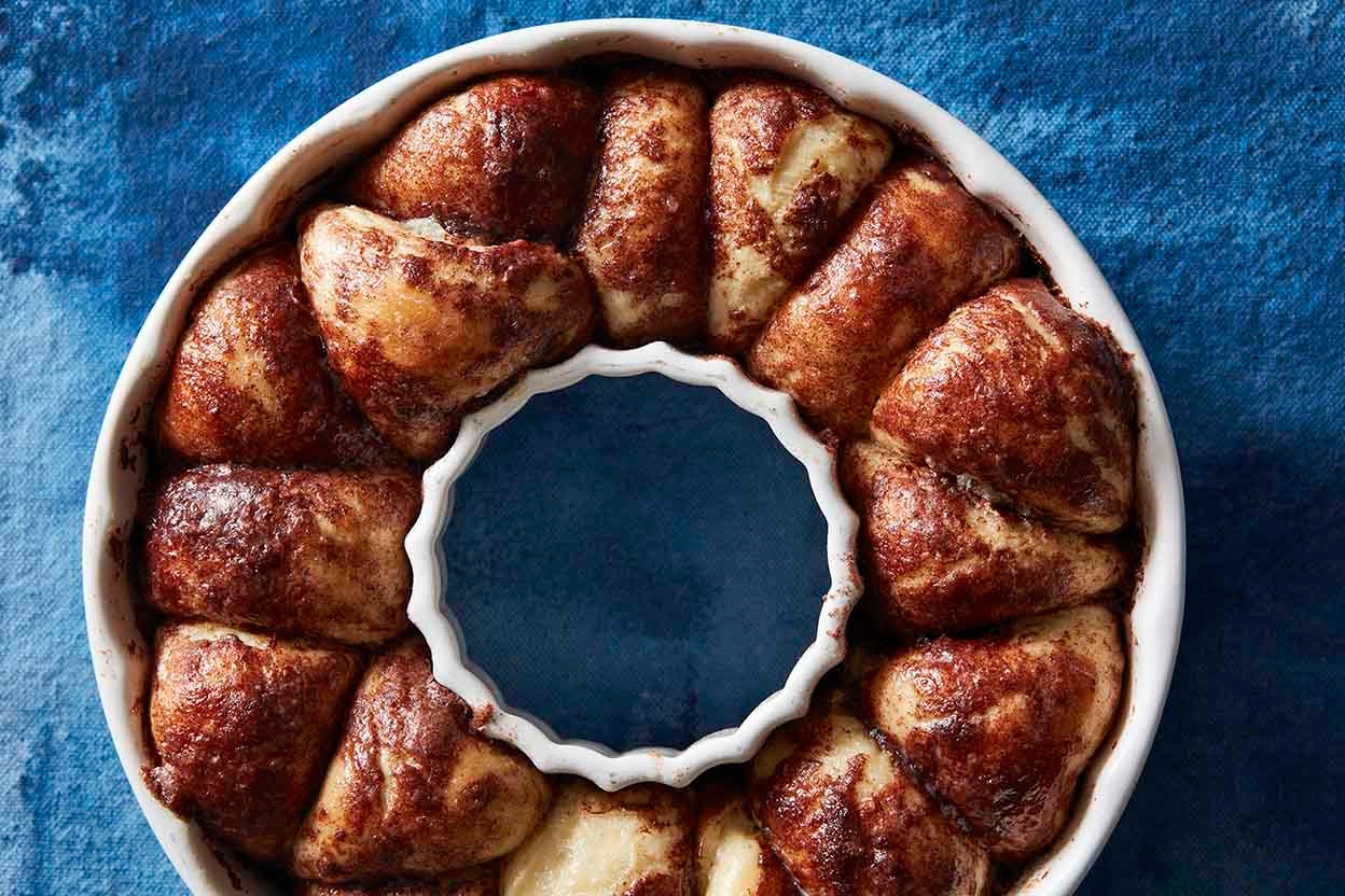 Lightly grease an 8" round cake pan or 9" tube pan. Dip each dough piece in water, then roll it in the cinnamon-sugar mixture to coat.