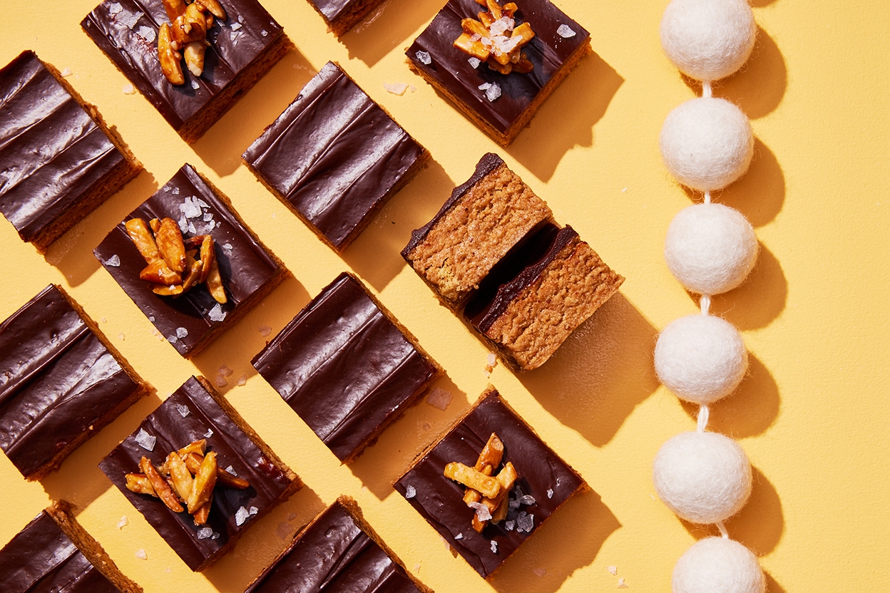 When your oven needs a break but you need a satisfying, nutty-chocolate treat, make these easy, no-bake almond butter bars. The base layer of almond butter includes a touch of honey, vanilla, and salt for amped-up flavor, plus graham cracker crumbs for a pleasant crunch and cookie-like texture. The candied almond topping is optional but recommended — it's as pretty as it is delicious.