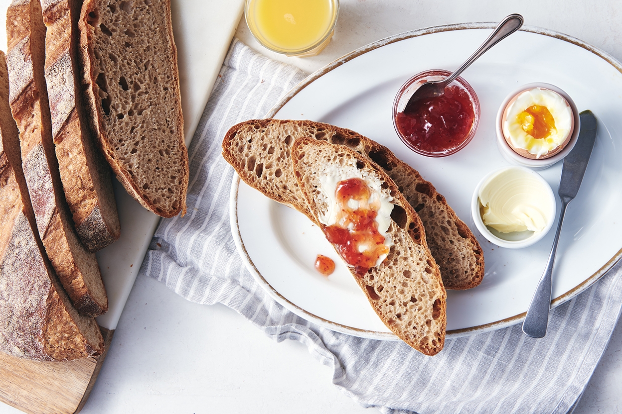 Remove the bread from the oven. Wait until the bread is completely cool before slicing; cutting into a loaf of hot bread can make it irreparably gummy.