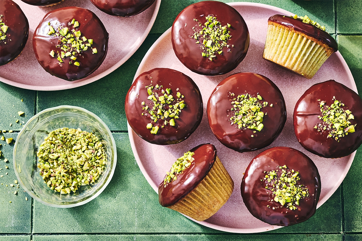 Pistachio-Cardamom Cupcakes with Dark Chocolate Ganache
