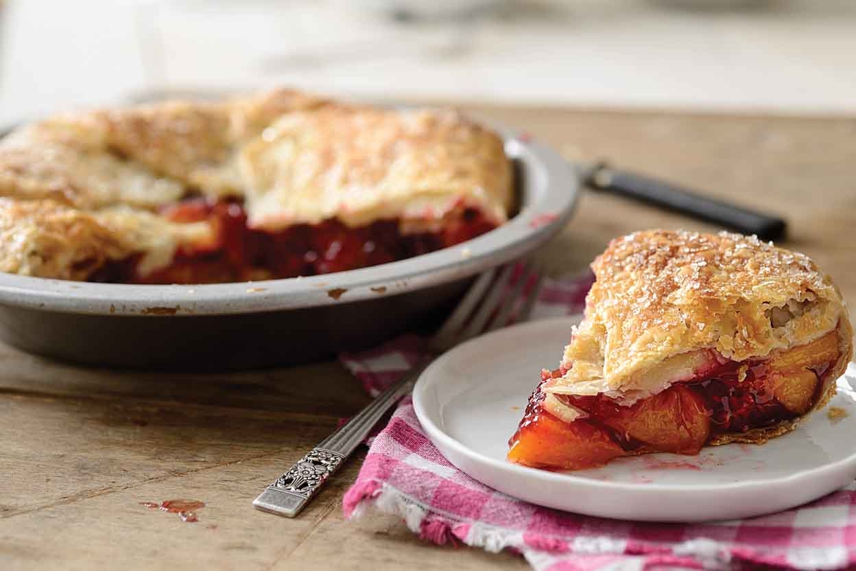 And the "rustic" part of this pie is not making it with either a traditional single crust, or classic double crust, but with a hybrid. One large crust envelops most of the filling, but leaves a bit exposed: a gorgeous, ruby-red crown on this bubbling fruit pie.