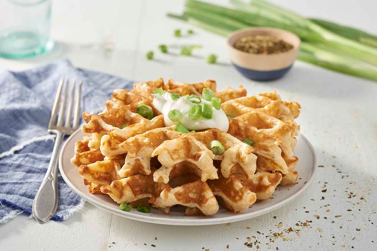 With their melting pockets of cheese, these tender-crisp waffles are delicious with over-easy or scrambled eggs at breakfast, or with fried chicken or sautéed garlicky mushrooms at dinner.