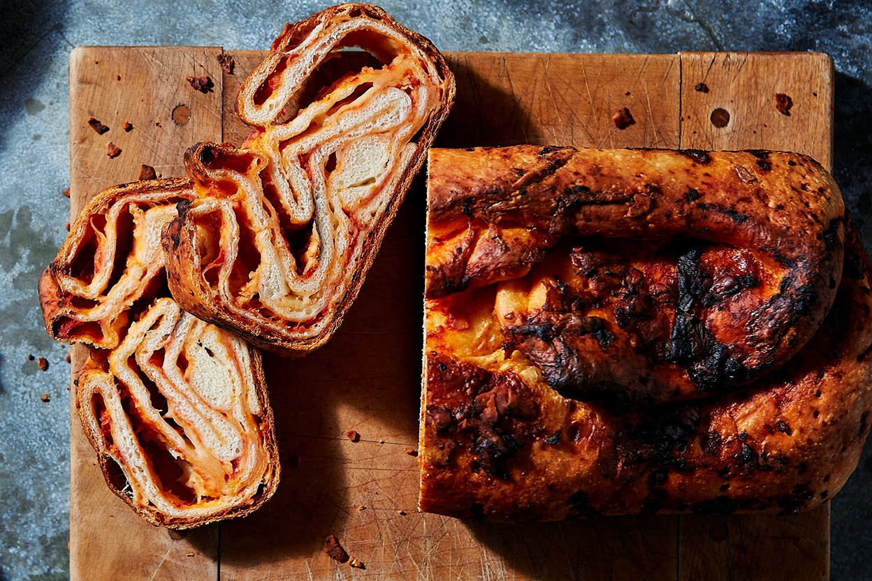 Toward the end of the dough’s rise, preheat the oven to 450°F. Coat the inside of a 9” x 5” loaf pan with olive oil.