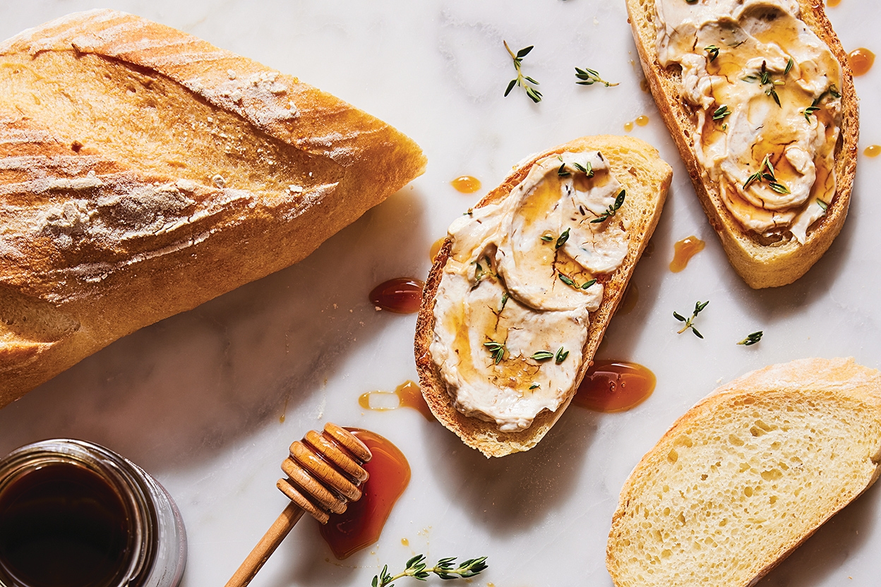 To make the delicious spread pictured above, combine 8 ounces (227g) of room temperature cream cheese with 2 to 3 tablespoons of Blake Hill Caramelized Onion Jam. Spread it on top of the sliced baguette and then drizzle with Chipotle Morita Infused Honey and garnish with fresh thyme.