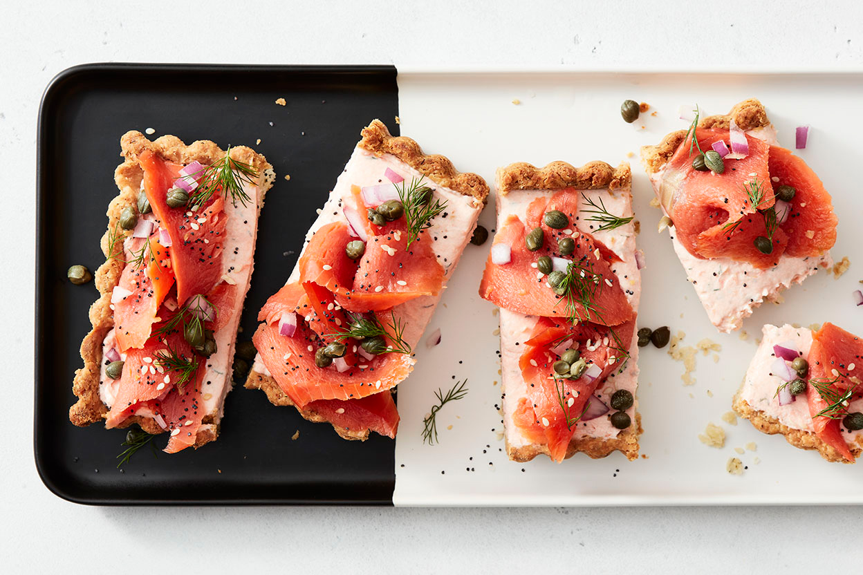 This elegant tart features a savory cream cheese mousse inside a crisp dill-flavored crust, all topped with gleaming slices of smoked salmon.