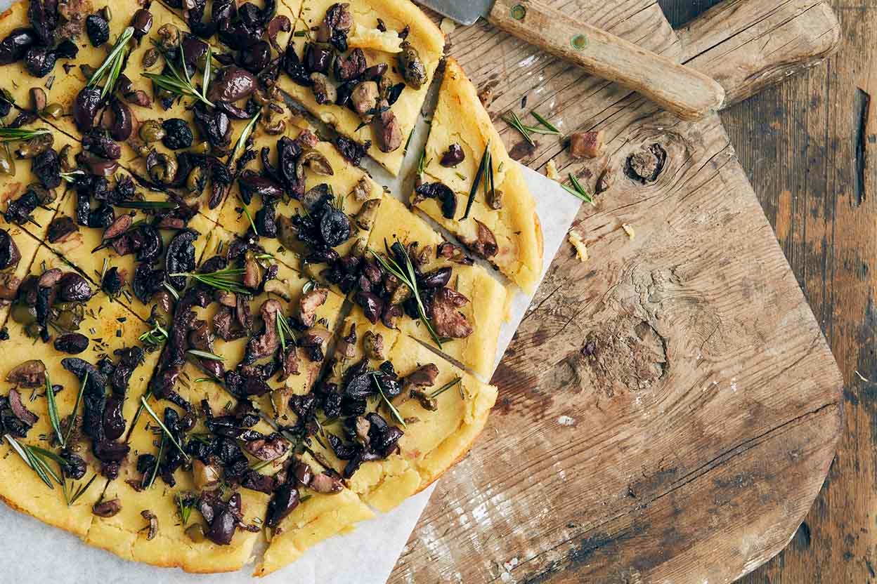 A thick chickpea crêpe often found at street carts in the south of France, socca is usually served with the barest of garnishes. We’ve flecked it with fresh rosemary and given it a sprinkling of olives, as you might find it from a stall on the Côte d’Azur.