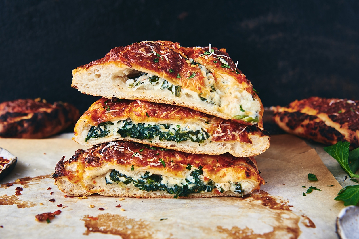 What's a calzone? Simply put, it's pizza crust wrapped around its topping, rather than supporting it from beneath. You know how, when eating a slice of thin-crust pizza, you fold it in half so it doesn't droop and the cheese and tomato sauce stay put? A calzone is thin-crust pizza folded before you bake it — rather than after!