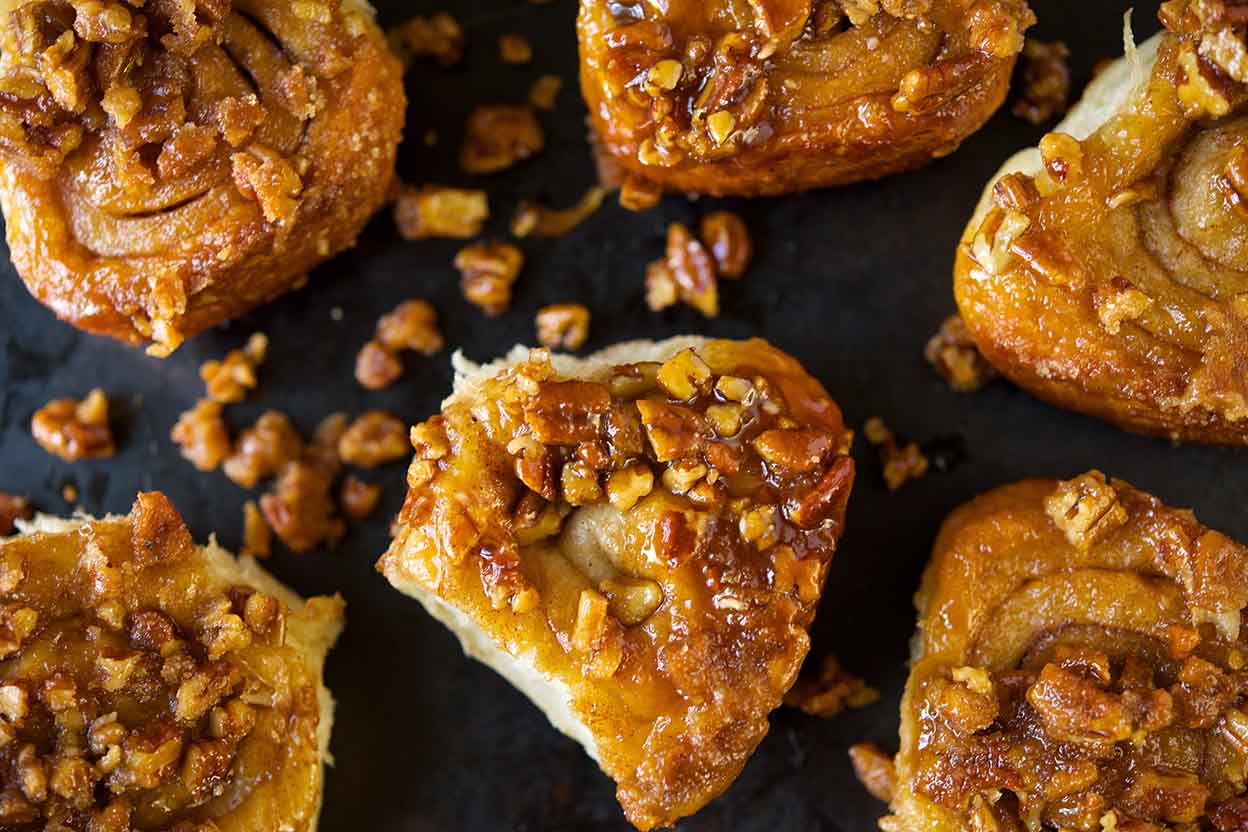 Remove the buns from the oven, and loosen their edges with a knife. Carefully — the sugar is hot! — turn them out onto a rack or parchment-covered sheet pan to cool, scraping any glaze that may have stuck to the pan onto the warm buns.