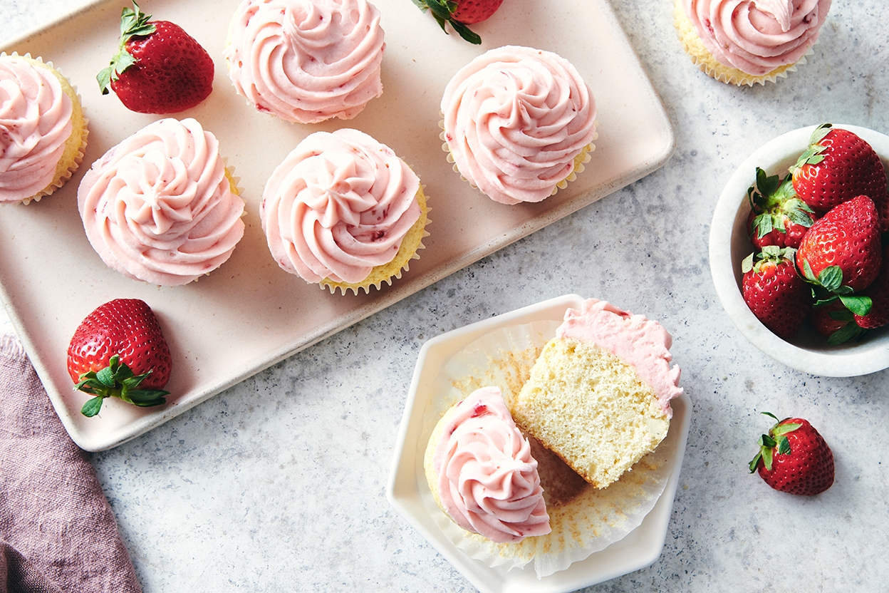 These light and tender cupcakes wear a sweet, fruity hat of fresh strawberry frosting.