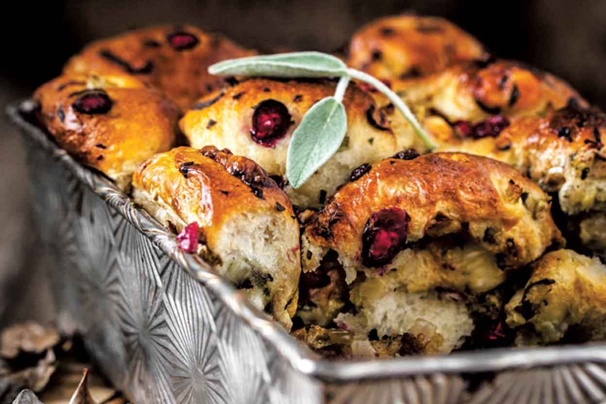 2. For the filling: Melt the butter in a large skillet over medium heat. Add the celery and onions, and cook until the vegetables are softened. Remove from the heat and add the sausage, chopped sage, poultry seasoning, and cranberries. Cool to lukewarm, then stir in the cheese and eggs. Season with salt and pepper.
