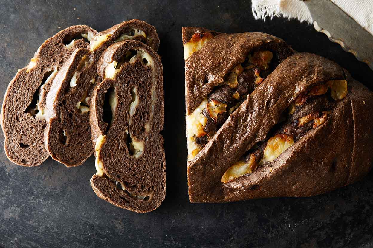 We modeled this cheese-swirled rye loaf after that of a small family bakery, then added some onions for a little extra zing. You'll enjoy this hearty loaf on its own or as a great base for Reuben sandwiches.