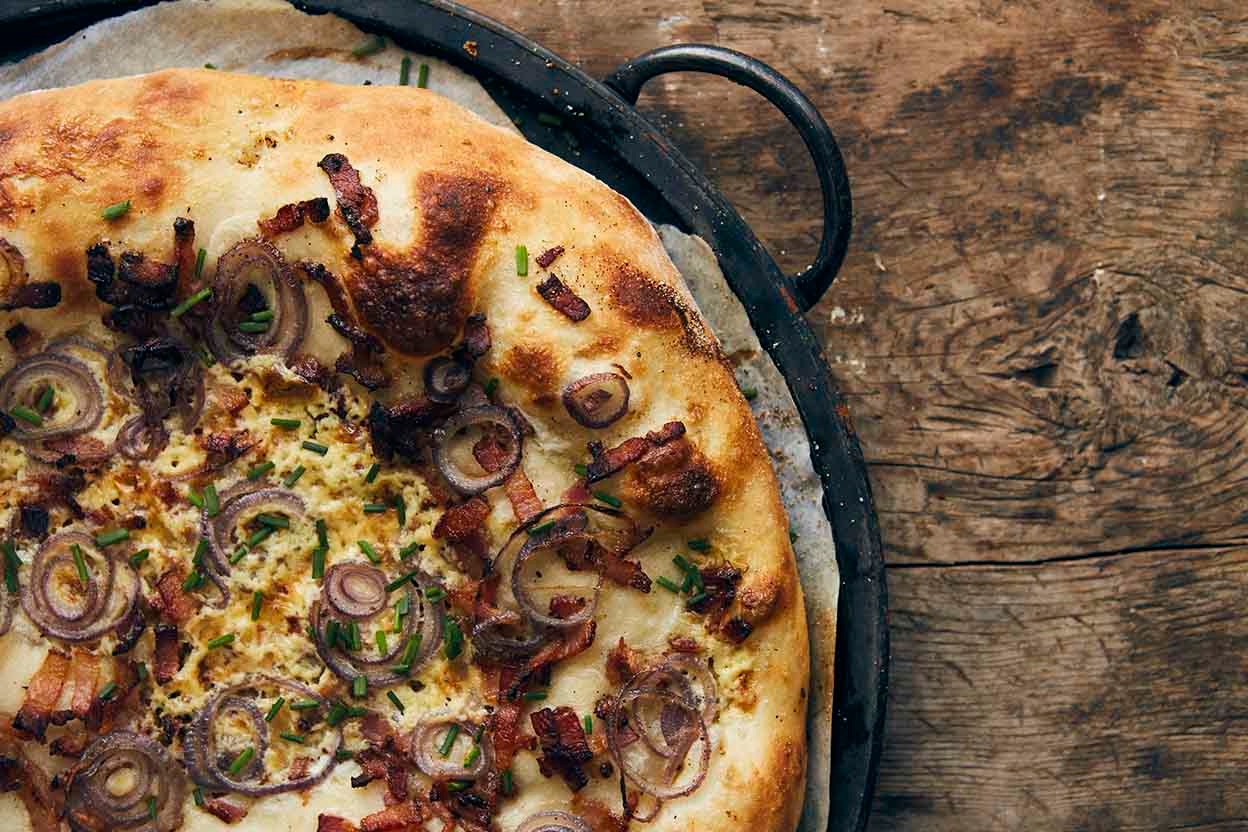 In the Alsace region of France, this pizza-like bread was born as a means of testing the heat of the wood-fired oven. If the pie baked quickly and well, the oven was ready for the hearth breads waiting to be baked after it. This recipe for tarte flambé comes courtesy of Master Baker and author Jeffrey Hamelman.