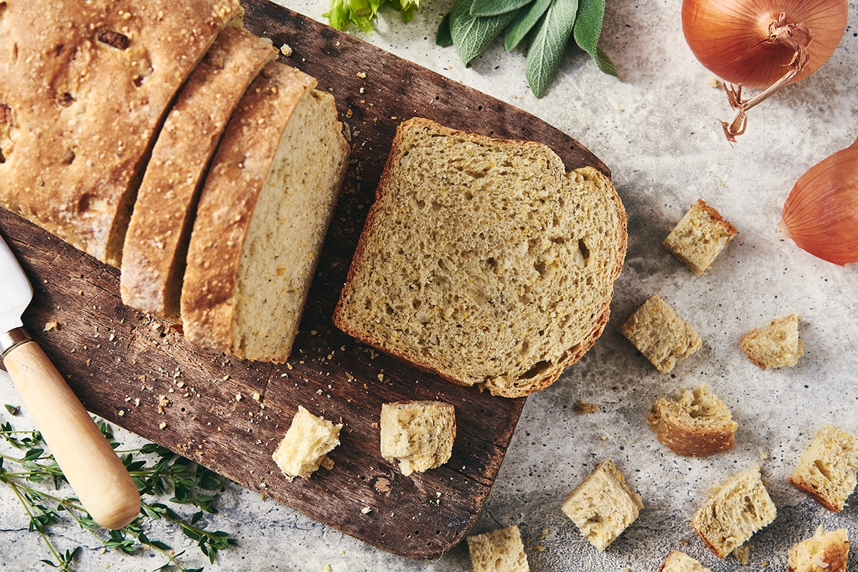 Here's a loaf with the seasonings — sage, thyme, rosemary, marjoram, celery — you'd find in your favorite turkey stuffing. Bake a loaf and make stuffing. Or better yet, use this tasty bread for turkey sandwiches the day after.