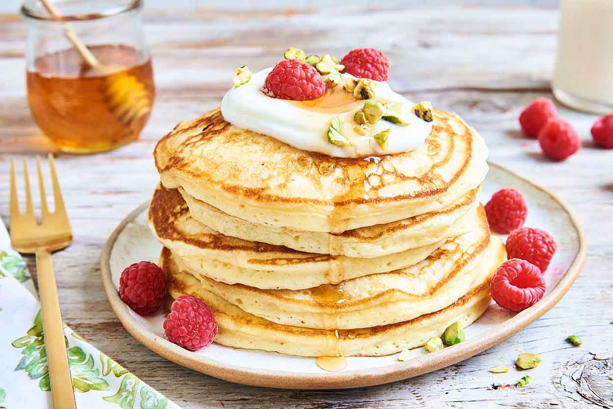 The flavor of whey (obtained by draining yogurt in a fine sieve) is similar to that of buttermilk, though the liquid itself is much thinner. Whey's natural acidity reacts perfectly with baking soda to produce wonderful leavening (carbon dioxide bubbles) in these pancakes. Not only will they be light and fluffy, any leftovers will stay soft and fresh thanks to that same acidity.