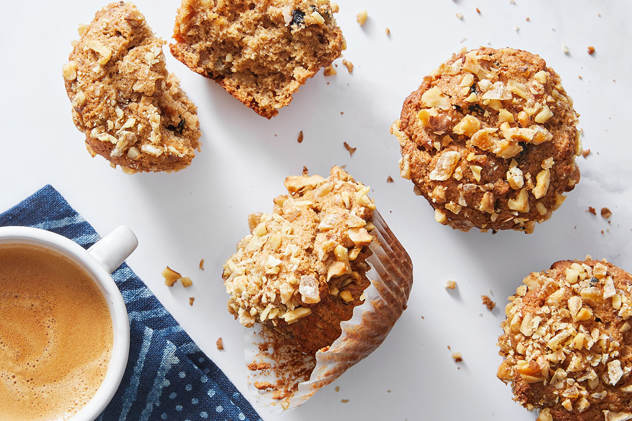 Applesauce and whole grain flour bake up very well together. The liquid from the applesauce softens the bran in the flour, and the flavors combine to make a sweet, nutty background note. Mixed up with ginger and cinnamon, nuts and raisins, these intensely apple-flavored muffins have a bit of crunch and hints of spice.