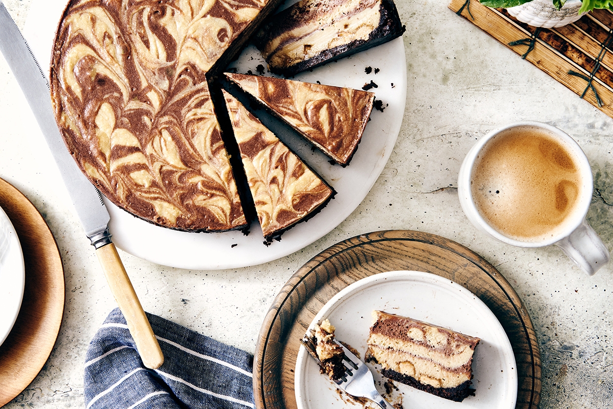 Transfer the fillings to the pan. Start by adding about half the vanilla tahini filling, then about half the chocolate filling, followed by about two-thirds of the remaining vanilla filling, then the remainder of the chocolate filling. Dollop the last of the vanilla filling on top. Gently swirl the fillings together using a butter knife or wooden skewer.